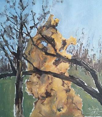 艺术家齐亮写生油画作品《芦苇和树》